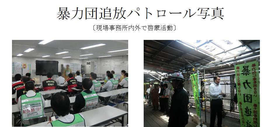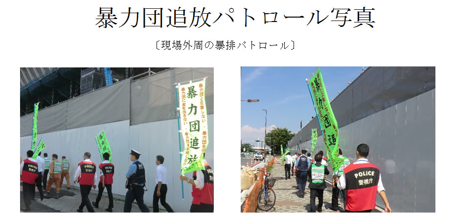 「暴力団排除パトロール」の実績ではオリンピック施設工事作業所で警視庁本部関係部署と担当所轄警察署担当課のご協力を得て弊社警察官OB及び工事関係者の参加のもとで実施されました。